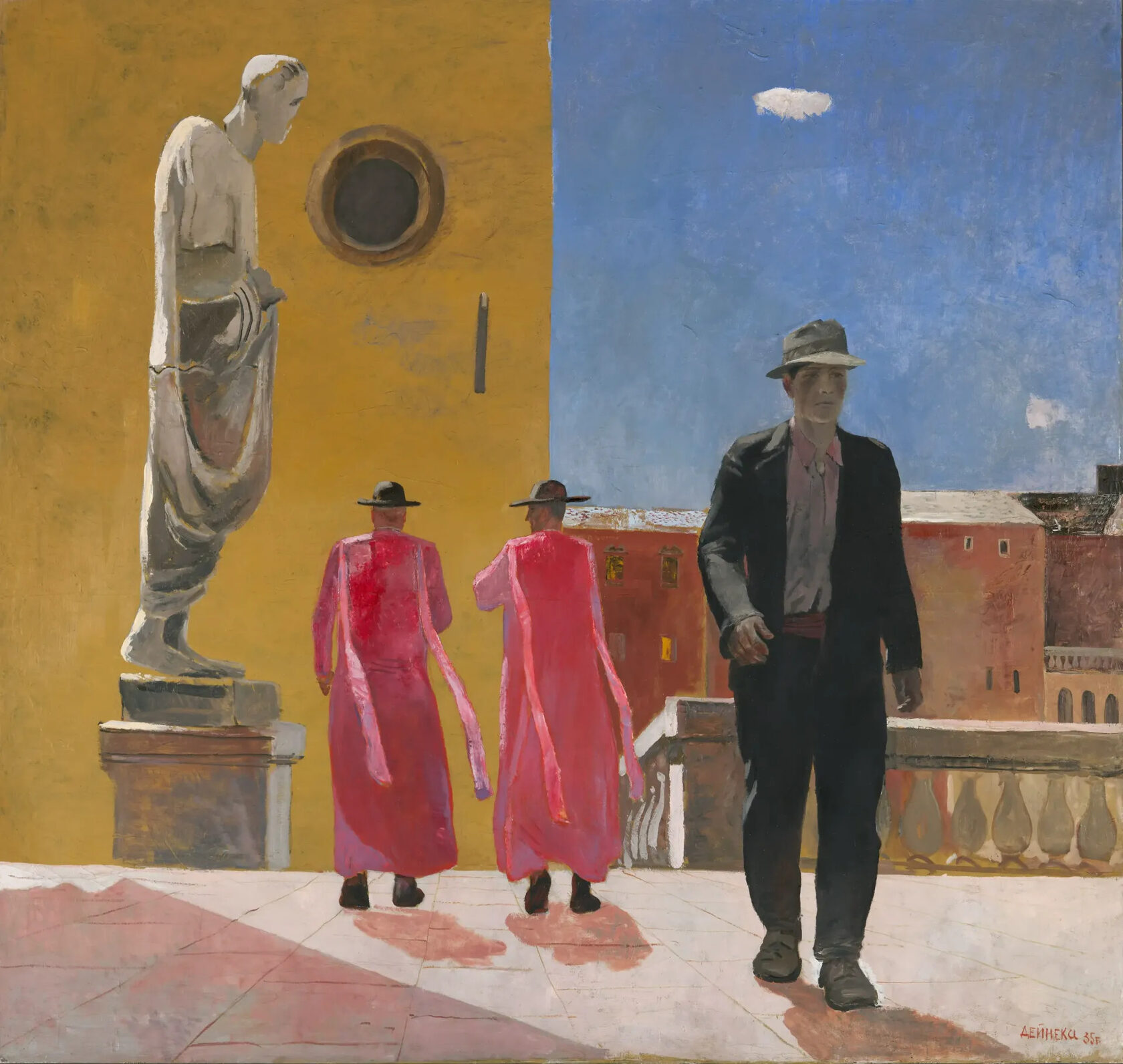 Там, где итальянские мастера углубляются в светотень, тонкую моделировку форм, поиск внутренних состояний, Дейнека делает ставку на силу линии, предельную четкость и динамику. Его живопись убедительна и безапелляционна, а изображение стремится не просто к эффектности, но к непосредственному воздействию.